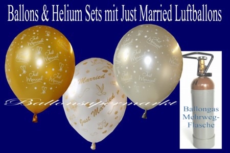 Luftballons zur Hochzeit mit dem Aufdruck "Just Married" Hochzeitstauben, Hochzeitsgkocken und Herzen der Liebe in den Farben Weiß, Silber und Gold zum Steigenlassen der Ballons mit Helium.