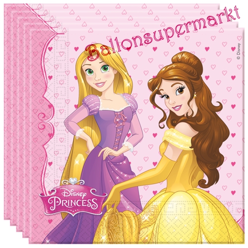 20 Kindergeburtstags-Servietten mit Rapunzel, Cinderella, Belle und Dornröschen, den beliebten Prinzessinnen aus dem Disney Universum.
