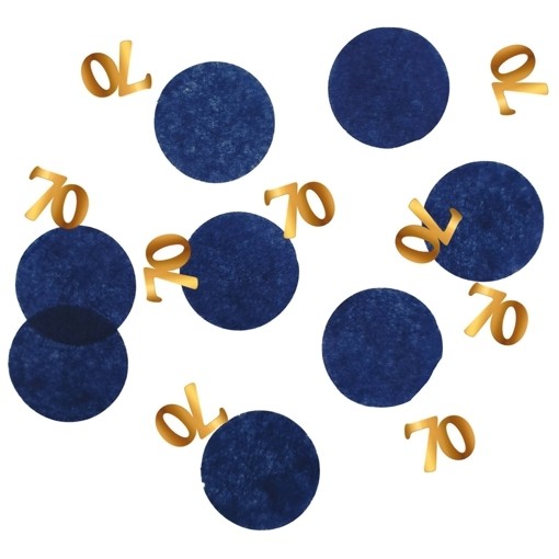 2 verschiedene Sorten Streu-Konfetti: 1. Zahl 70 Gold Metallic - 2. Punkte aus Seidenpapier Dunkelblau, insgesamt 25 Gramm