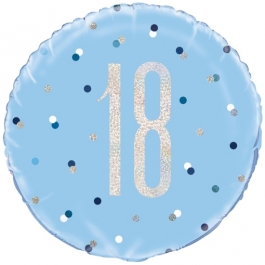 Runder Luftballon aus Folie zum 18. Geburtstag in Blau mit holografischem Glitzereffekt, bedruckt mit Punkten und der Zahl 18 in Silber.
