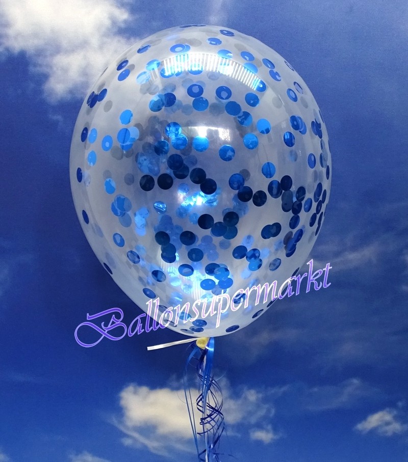 Jumbo Rund-Luftballons in der Größe von 45 cm Durchmesser, gefüllt mit blauem Konfetti, Kristall, transparent für Ballondekoration, Hochzeiten, Babypartys, Werbeaktionen mit Luftballons, Tischdekoration, Luftballontrauben und Luftballonkugeln. Jede Veranstaltung ob Feier zur Geburt, zur Taufe, Kiderfest und Kinderparty, Hochzeit und Polterabend, erhält einen festlichen Rahmen mit diesen qualtativ hochwertigen Luftballons. Diese Luftballons lassen sich besonders gut mit Helium dekorieren, da sie für Ballongas gut geeignet sind. Die Geschmeidigkeit dieser Ballons spricht für sich. Nur gute Qualität ist so weich und angenehm zu verarbeiten, wie diese Qualitätsluftballons. Auch bei Dekorationen für größere Feiern, Veranstaltungen und Partys stellen diese Luftballons keine Hürde in der Verarbeitung von größeren Mengen. Relativ leicht und einfach lässt sich der Ballon verknoten oder zu Luftballongirlanden oder Luftballonspiralen verarbeiten. Auch in der Farbe und Konsistenz ist dieser hochwertige Latexballon beständig.