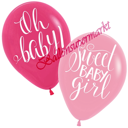 Bezaubernde Luftballons aus Latex in Rosa mit "Sweet Baby Girl" Print und in Pink mit "Oh Baby!" Print. Wunderschöne Dekoration zur Babyparty, Geburt oder Taufe eines kleinen Mädchens.