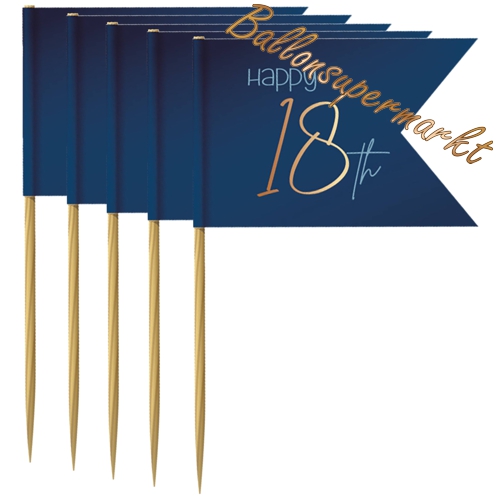 Deko-Picker zum 18. Geburtstag in Dunkelblau, bedruckt in edlem Gold Metallic mit der Aufschrift: Happy 18th.