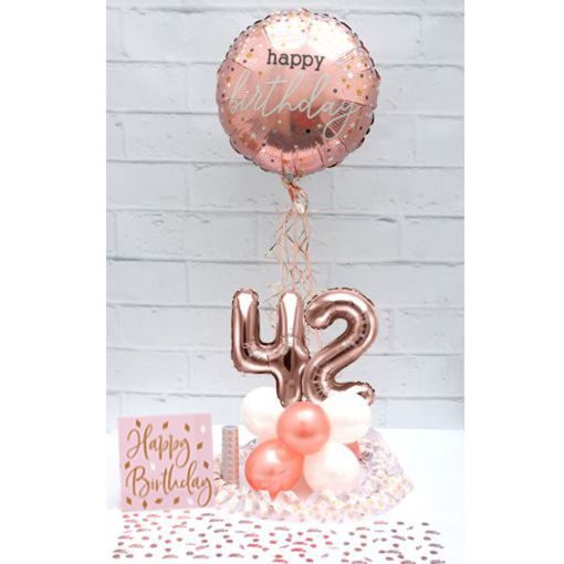 Dekoratives Partydeko-Set zum Geburtstag mit der Geburtstagszahl 42. Mit diesem attraktiven Set gestalten Sie den 42. Geburtstag auf festliche und kreative Art. Mit wenigen Handgriffen dekorieren Sie den Geburtstagstisch mit der wunderschönen Tischdekoration, bestehend aus 8 Luftballons 12 cm in Roségold und Weiß (Luftfüllung), 1 Folienballon Zahl 4, 35 cm (Luftfüllung) ,1 Folienballon Zahl 2, 35 cm (Luftfüllung) und 1 Folienballon "Happy Birthday" 45 cm (Luft- oder Heliumfüllung)