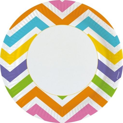 Weiße Partydeko-Teller, bedruckt mit bunten Konfettistreifen,