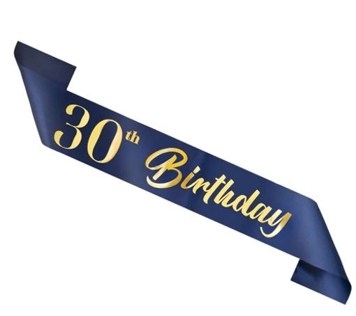 Schärpe zum 30. Geburtstag mit in Blau und Gold mit der Aufschrift: Happy 30th.