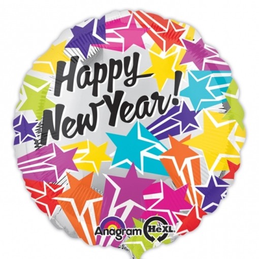Runder Luftballon aus Folie, bunt bedruckt mit Sternen und der Aufschrift: Happy New Year - Frohes neues Jahr!