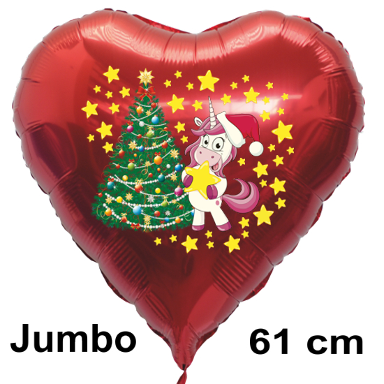 Herzförmiger Luftballon aus Folie, bedruckt mit dem Einhorn und einem Weihnachtsbaum