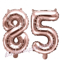 Luftballons Zahl 85, Zahlendekoration mit roségoldenen Luftballons aus Folie